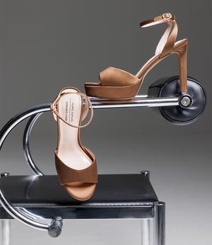The SELMA110 platform sandal, part of the Platinum Collection by Filippo Raphael for Edward Meller, is an elegant blend of style and stability. Expertly crafted from soft suede or delicate silk, this design features a round open-toe shape and buckle-fastening straps for a secure fit. Set on 110 mm slim heels and balanced by a sturdy platform, the SELMA110 is perfect for special occasions or adding a sophisticated lift to your evening wardrobe.
