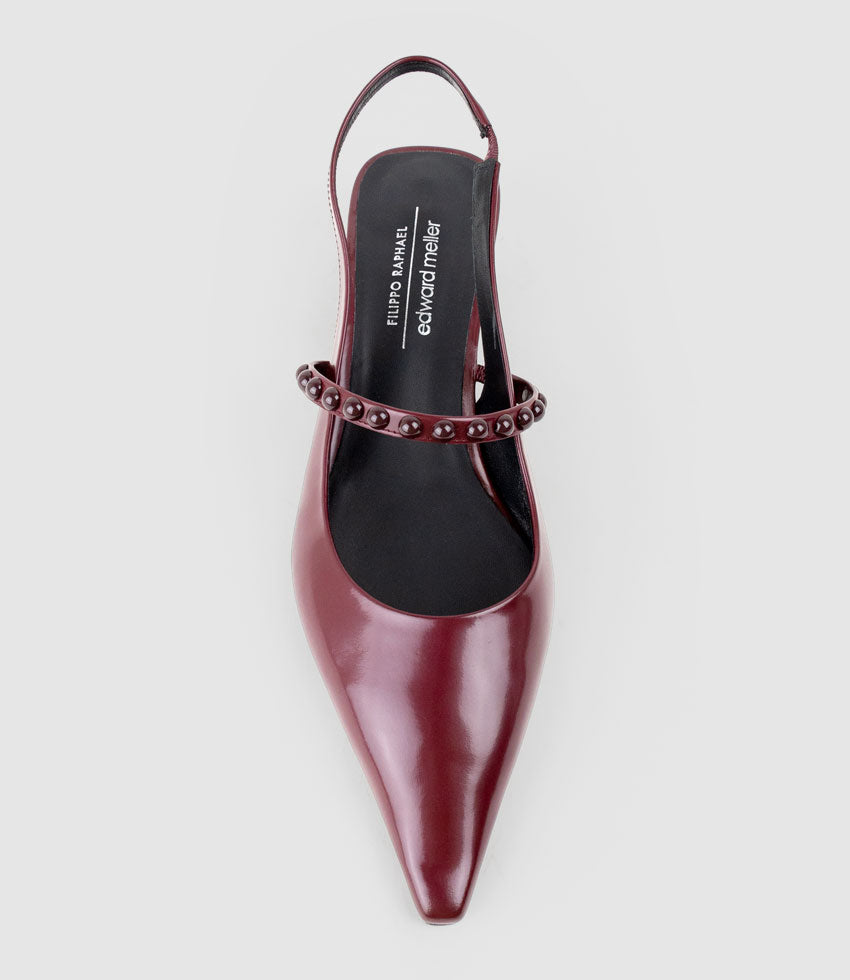 The DUFFY30 slingback pumps by Filippo Raphael for Edward Meller combine timeless Mary Jane charm with contemporary details. Expertly crafted in Spain from high-shine leather, they feature a pointed toe, and a delicate Mary Jane strap embellished with tonal studs for a modern edge. Set on a 30 mm kitten heel and finished with a sleek slingback strap, these pumps are elegant and versatile. The full leather lining ensures breathability and all-day comfort, making the DUFFY30 a chic addition to any wardrobe.