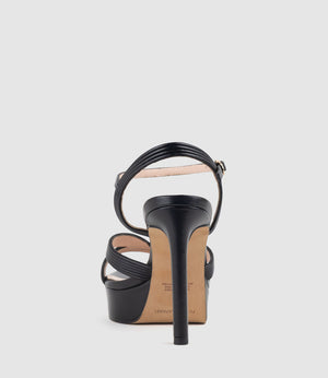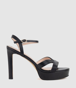 The SIERRA110 platform sandal by Filippo Raphael for Edward Meller is a statement style from the Platinum Collection. Crafted with wide straps featuring a distinctive ribbed effect, it balances bold design with refined detail. Set on 110 mm block heels and grounded by a supportive platform, this pair offers height with stability. The buckle-fastening ankle strap ensures a secure fit, while the leather lining keeps things comfortable. Perfect for event dressing or adding drama to your evening wardrobe.