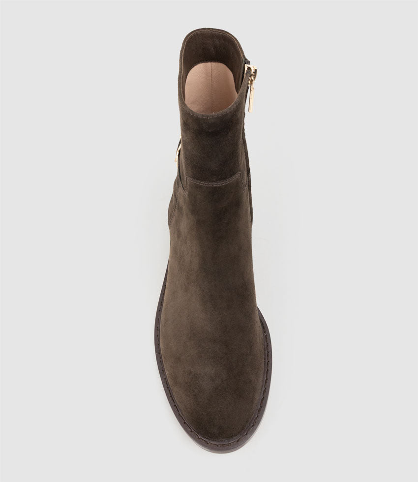 Meet the WOAD30 by Filippo Raphael for Edward Meller. A refined ankle boot crafted from soft suede leather, designed with a buckled strap that nods to classic riding‑boot styling. Finished with a full‑length zip, round toe, and low heel, it offers effortless everyday wear. A cushioned PORON insole and full leather lining provide comfort and support from morning to night.