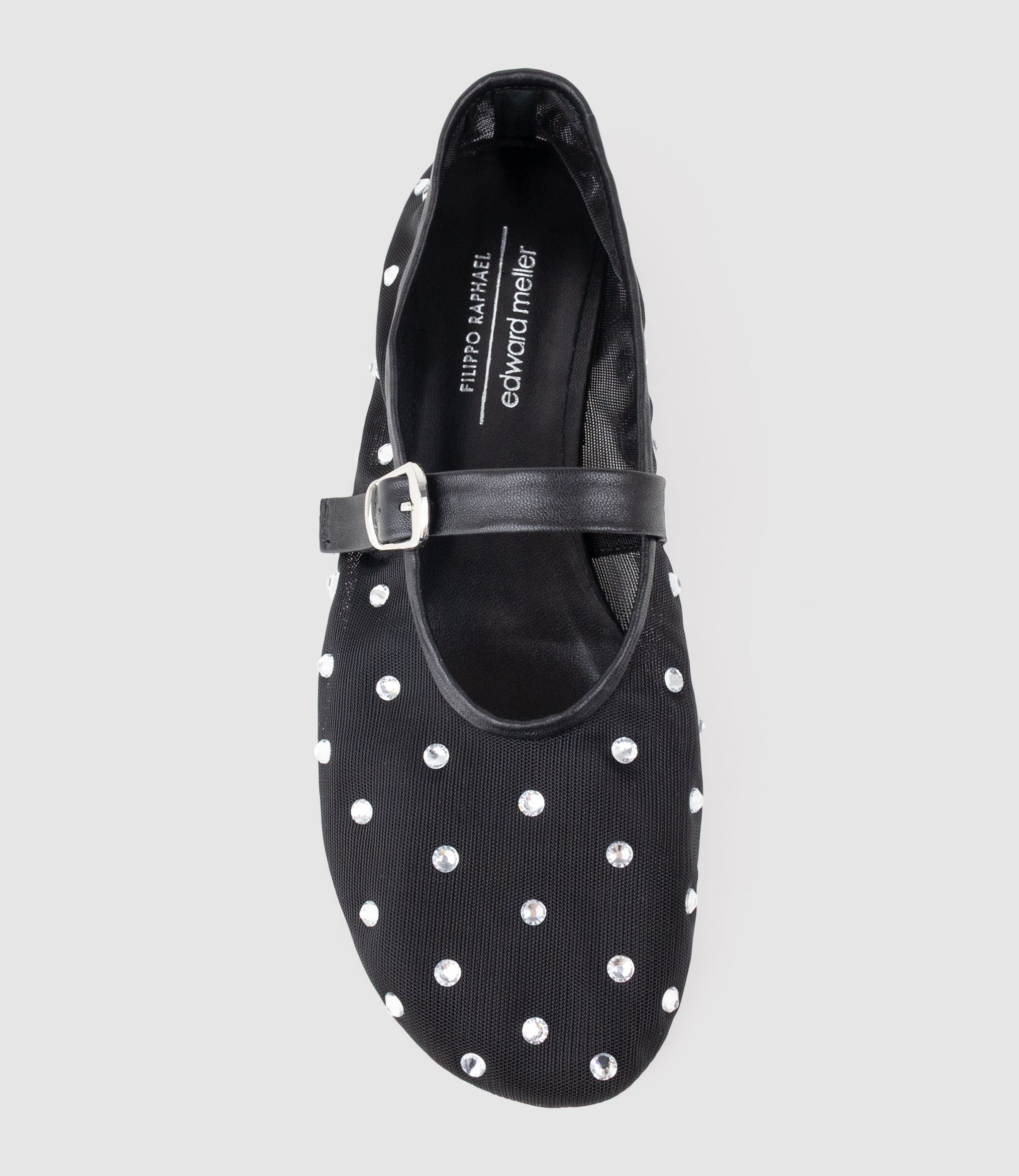 Delicate and charming, the ELMIRA mesh ballet flat by Filippo Raphael for Edward Meller is handcrafted in Spain from fine mesh embellished with delicate crystals. Its round toe and buckled Mary‑Jane strap lend a playful, feminine feel, while the leather sock lining ensures comfort. Perfect for special occasions, weddings, and elegant events, the ELMIRA brings a light, sparkling touch to any look.