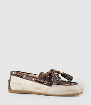 Relaxed yet polished, the GENOA boat shoe by Filippo Raphael for Edward Meller is crafted from distressed leather in a rich Brown Combo and finished with woven leather laces and subtle tasselled detailing. A slim sneaker sole, removable insole, and soft leather lining provide comfort and versatility for everyday wear. Perfect for work, casual outings, and effortless daily dressing, the GENOA delivers an easy blend of style and practicality.