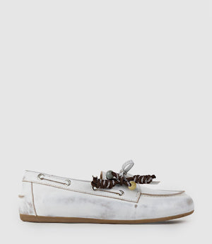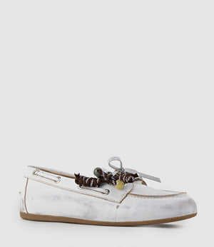 Relaxed yet refined, the GENOA boat shoe by Filippo Raphael for Edward Meller is crafted from distressed white leather and finished with a detachable lace ornament for a touch of personality. Set on a slim sneaker sole with leather laces, a removable insole, and soft leather lining, it offers comfort and versatility for daily wear. Perfect for work, casual outings, and everyday style, the GENOA brings an effortless, polished ease to any wardrobe.