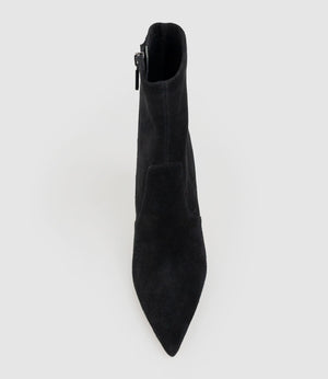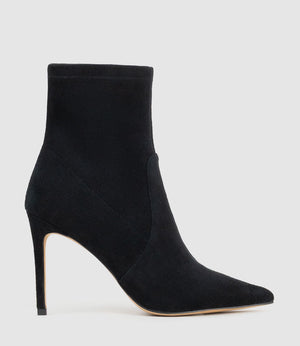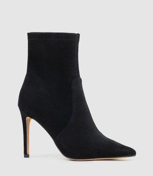 Meet the ZAHIR100 from The Platform Collection by Filippo Raphael for Edward Meller. A sleek full‑stretch sock boot designed for a smooth, sculpted fit. Finished with a pointed toe and a striking 100 mm stiletto heel, it creates a refined, elongated silhouette that transitions effortlessly from day to evening. A cushioned PORON insole and full leather sock lining provide comfort and support with every step.