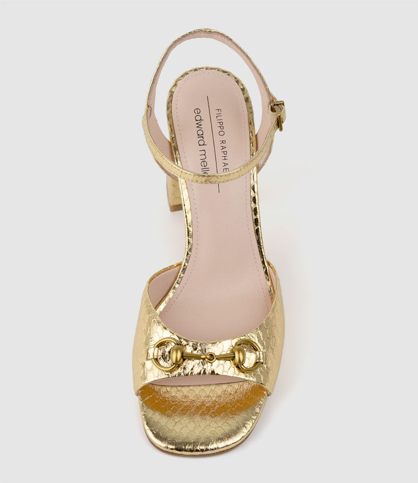 Introducing the KATO85 Sandal by Filippo Raphael for Edward Meller. These sandals are available in a range of versatile finishes, each topped with a chic horse-bit detail. They feature a classic round toe and an 85-mm block heel. The silhouette is simple and chic, perfect for any event.