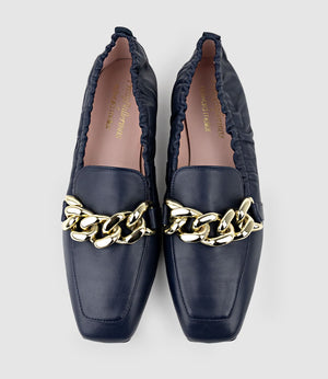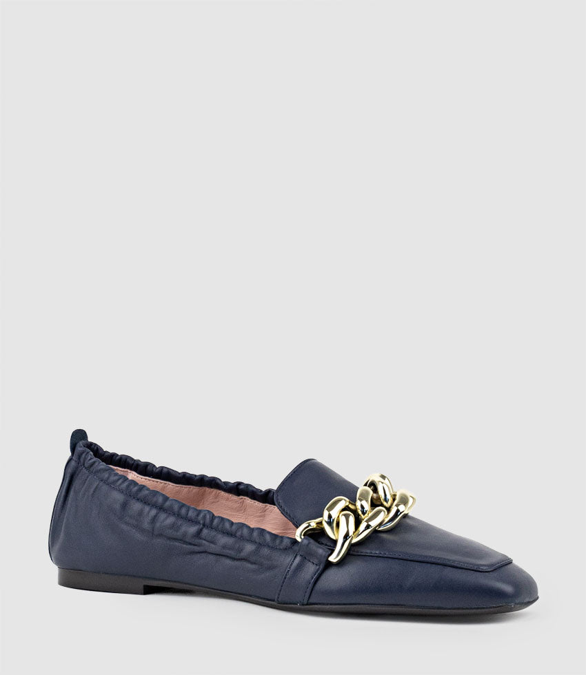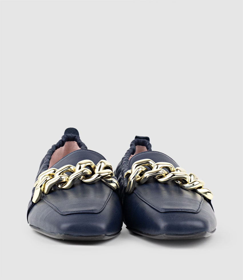 Introducing the GIANI Loafer by Pretty Ballerinas for Edward Meller. Crafted in Spain with meticulous care, these flats are a perfect fusion of comfort and sophistication. Made from supple leather using the sacchetto technique, they effortlessly mould to the natural curve of your feet. Featuring squared toes and a striking chunky gold chain detail, the GIANI loafers exude timeless style and modern flair, making them an ideal addition to your footwear collection.