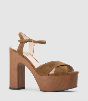 Introducing the RUNA125 by Filippo Raphael for Edward Meller. A bold platform sandal crafted with soft suede straps and a sculpted heel unit. Set on towering 125 mm block heels, the sole and platform are carved from a single piece for a seamless look and stable feel. Inspired by 70s wooden platforms, this style combines retro charm with modern confidence for elevated everyday dressing or standout events.